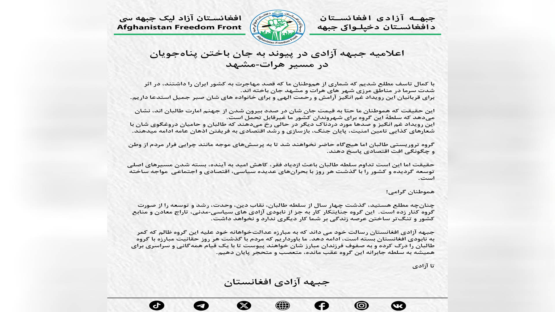 بر اساس این اعلامیه، جبهه آزادی با تأسف عمیق از جانباختن شماری از شهروندان افغانستانی که در تلاش برای مهاجرت به ایران، بر اثر سرمای شدید در مناطق مرزی میان هرات و مشهد جان خود را از دست دادهاند، خبر داده است. این جبهه تأکید کرده است که فرار مردم از کشور، حتی به بهای جانشان، گواهی روشن بر شکست کامل طالبان در تأمین حداقلهای زندگی، امنیت و کرامت انسانی است.