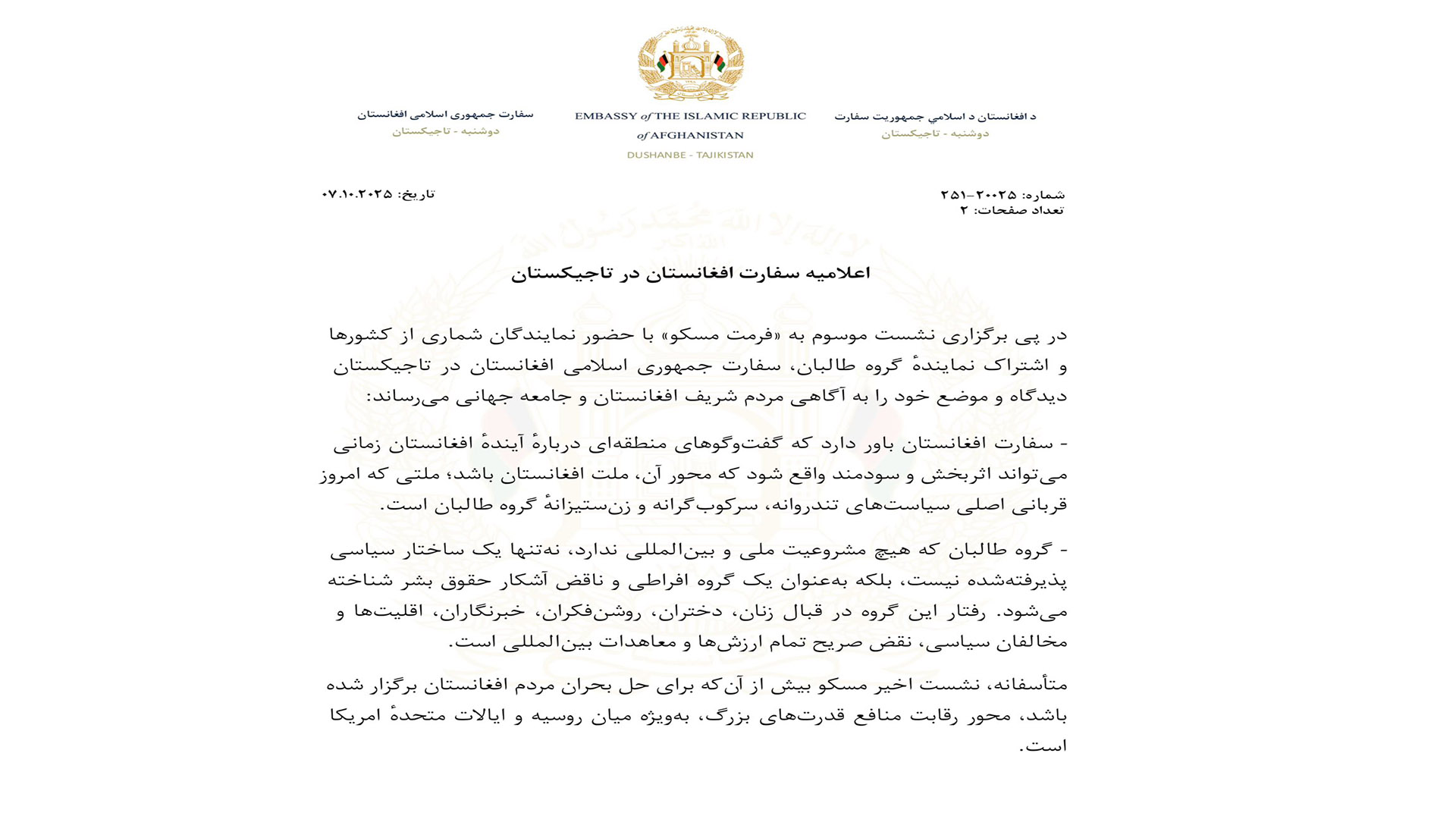 سفارت افغانستان در تاجیکستان در واکنش به نشست «فرمت مسکو» با حضور نمایندگان طالبان اعلام کرده است که گروه طالبان هیچ مشروعیت ملی و بین‌المللی ندارد و تنها به‌عنوان یک گروه افراطی و ناقض حقوق بشر شناخته می‌شود.