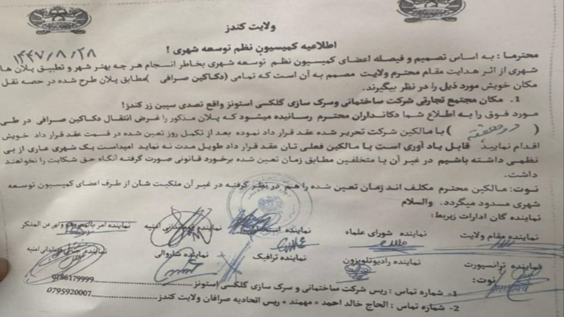 در همین حال، کمیسیون نظم توسعه شهری طالبان در قندوز با ارسال نامه‌هایی، دکان‌داران را مکلف کرده است که ظرف دو هفته قرارداد انتقال دکان‌ها را با شرکت ساختمانی امضا کنند و هشدار داده که در غیر آن با «متخلفین» برخورد خواهد شد.