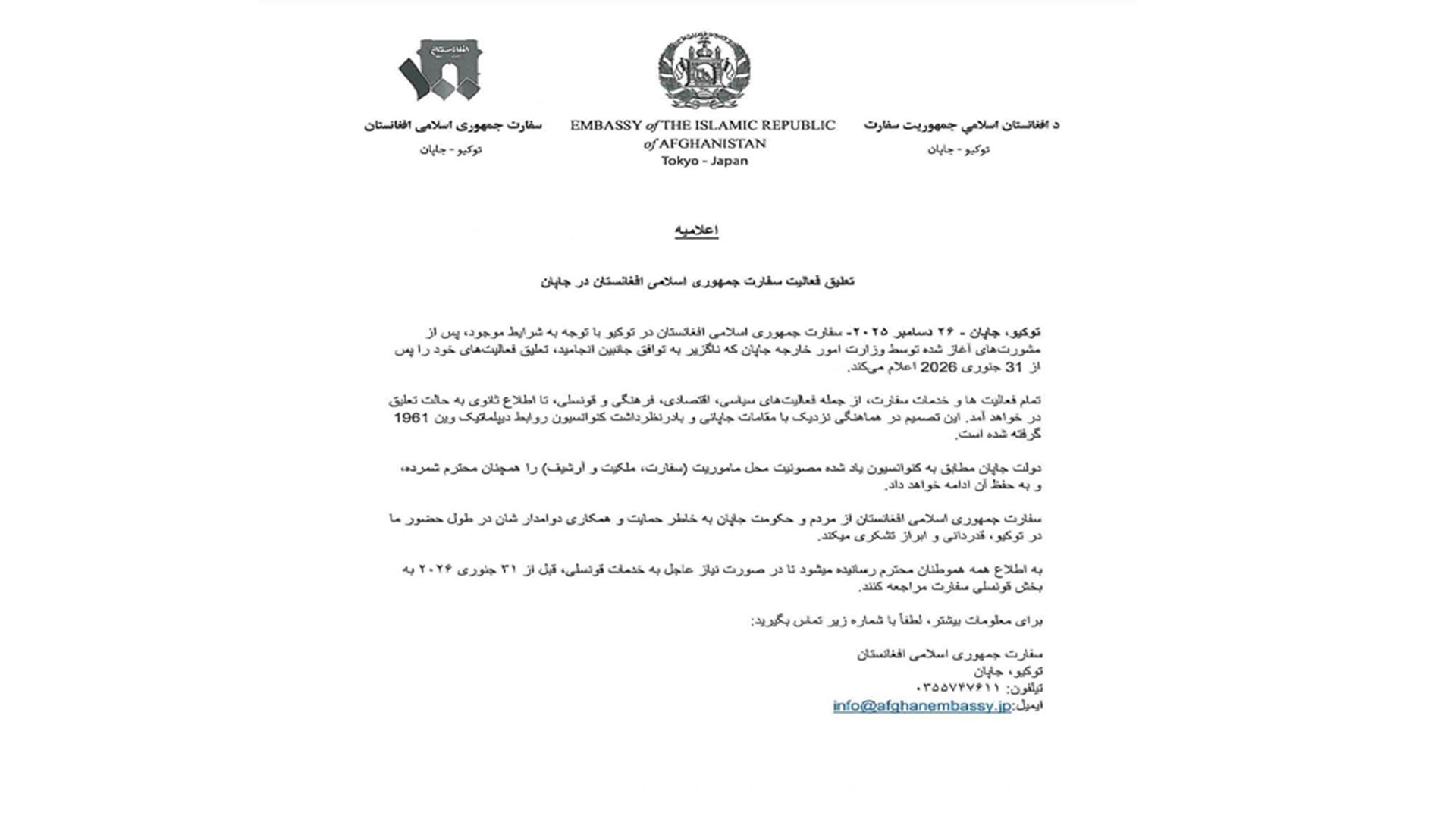 The speculation follows an announcement by the Afghan Embassy in Tokyo stating that all its activities and services will be suspended as of January 31, 2026, until further notice an action some observers interpret as preparation for a potential change in the embassy’s status.