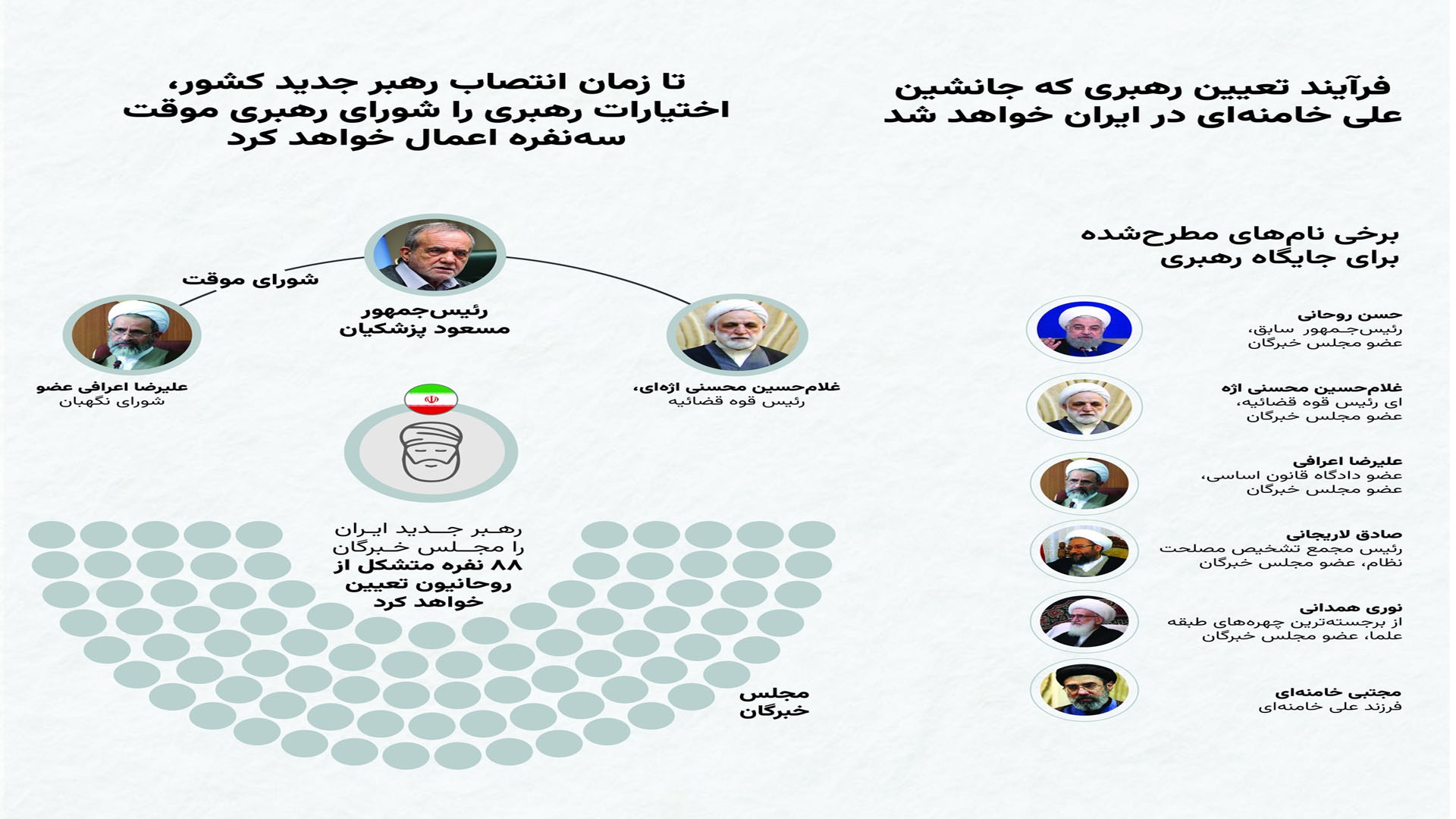 Until a new Leader is appointed, leadership authorities have been transferred to a temporary three-member council composed of Masoud Pezeshkian (President), Gholam-Hossein Mohseni-Ejei (Head of the Judiciary), and Alireza Arafi (member of the Guardian Council).