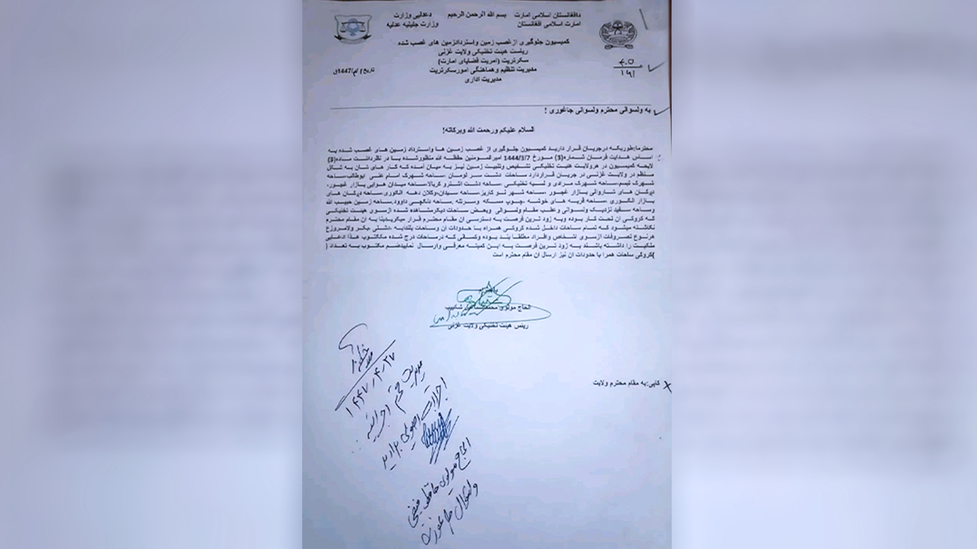 A letter issued by the Taliban in Jaghori indicates that several key areas, including Dasht Sar Loman, Tabassum Town, Moradi Town, the Technical High School, Ghajor Market, New Kariz Town, and other locations, are now claimed as their property.